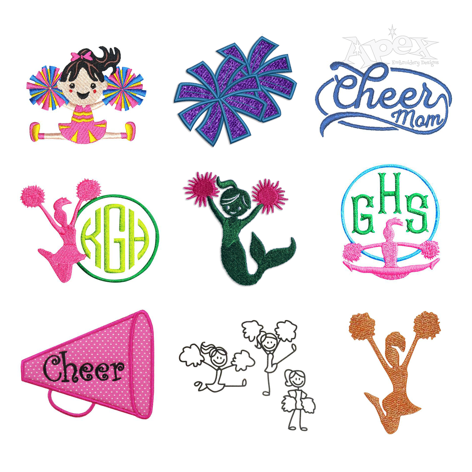 Cheerleading Cheerleader Bundle Machine Embroidery Design School Athletic Varsity Sport Team Digitized Sewing Pattern - Will look Nice on Sweaters, Jackets, T-shirt, Tote or Duffel Bags, etc.