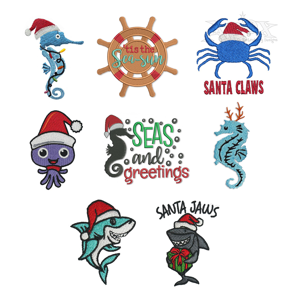 Christmas Sea Beach Animals Pack with Santa Shark Seahorse Octopus Crab Machine Embroidery Designs Sewing Files
