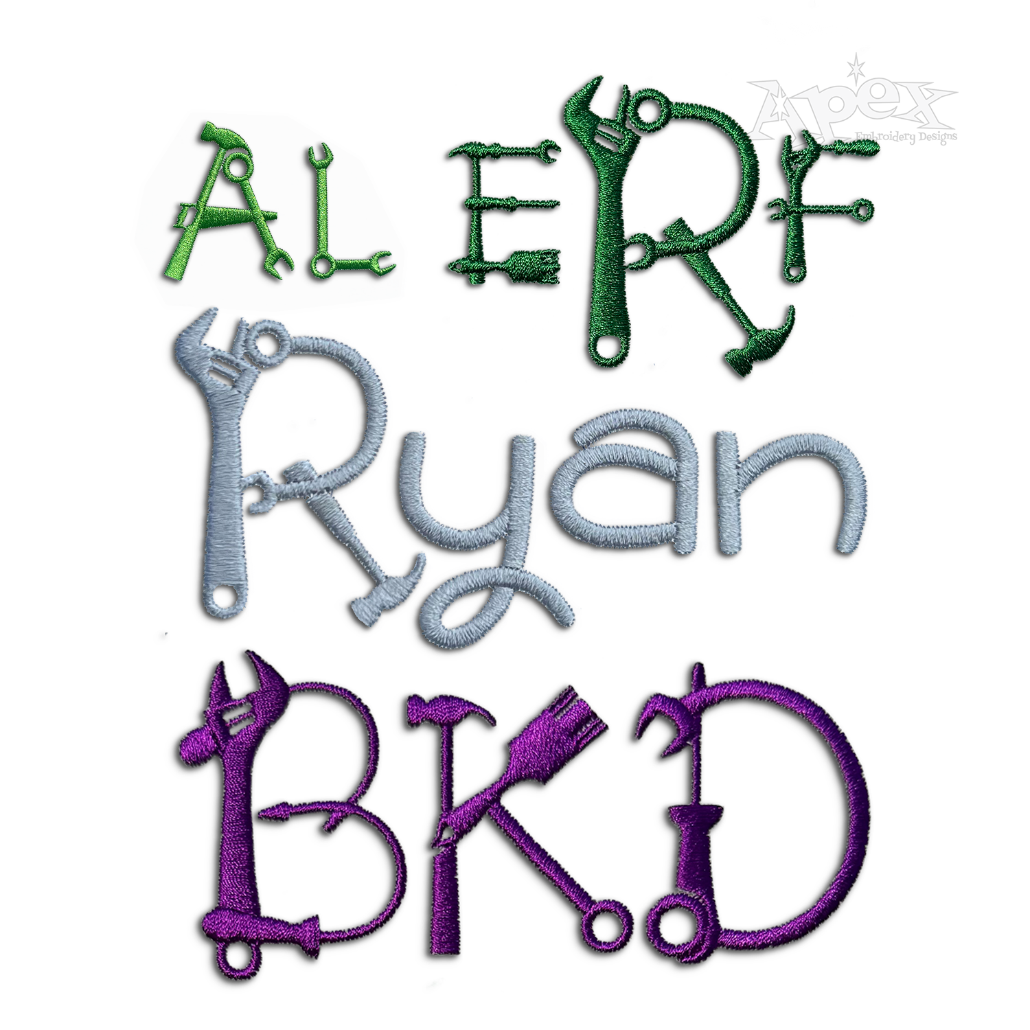 Dad Hand Work Tools Machine Embroidery Font Designs. Shed Shop Wrench, Hammer, Saw and Screwdriver Alphabet Letters